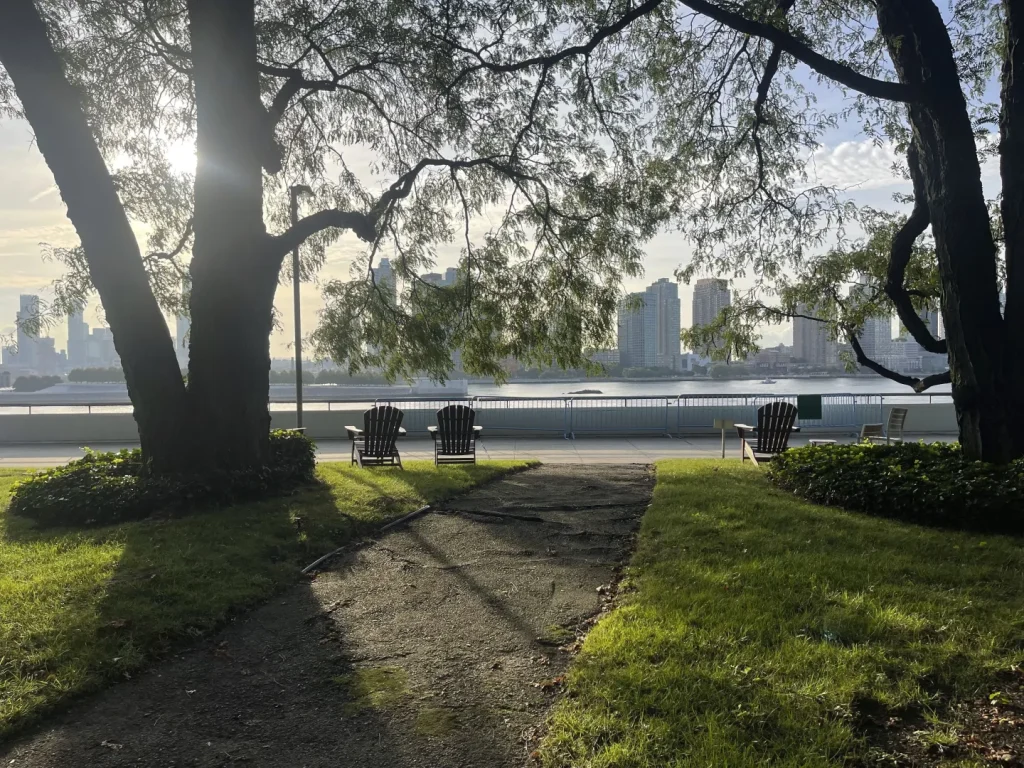 As you approach the edge of the East River, a collection of Adirondack chairs beckon weary souls to rest and contemplate the serene waters that stretch out towards the distant shores of Queens, a borough of New York City.