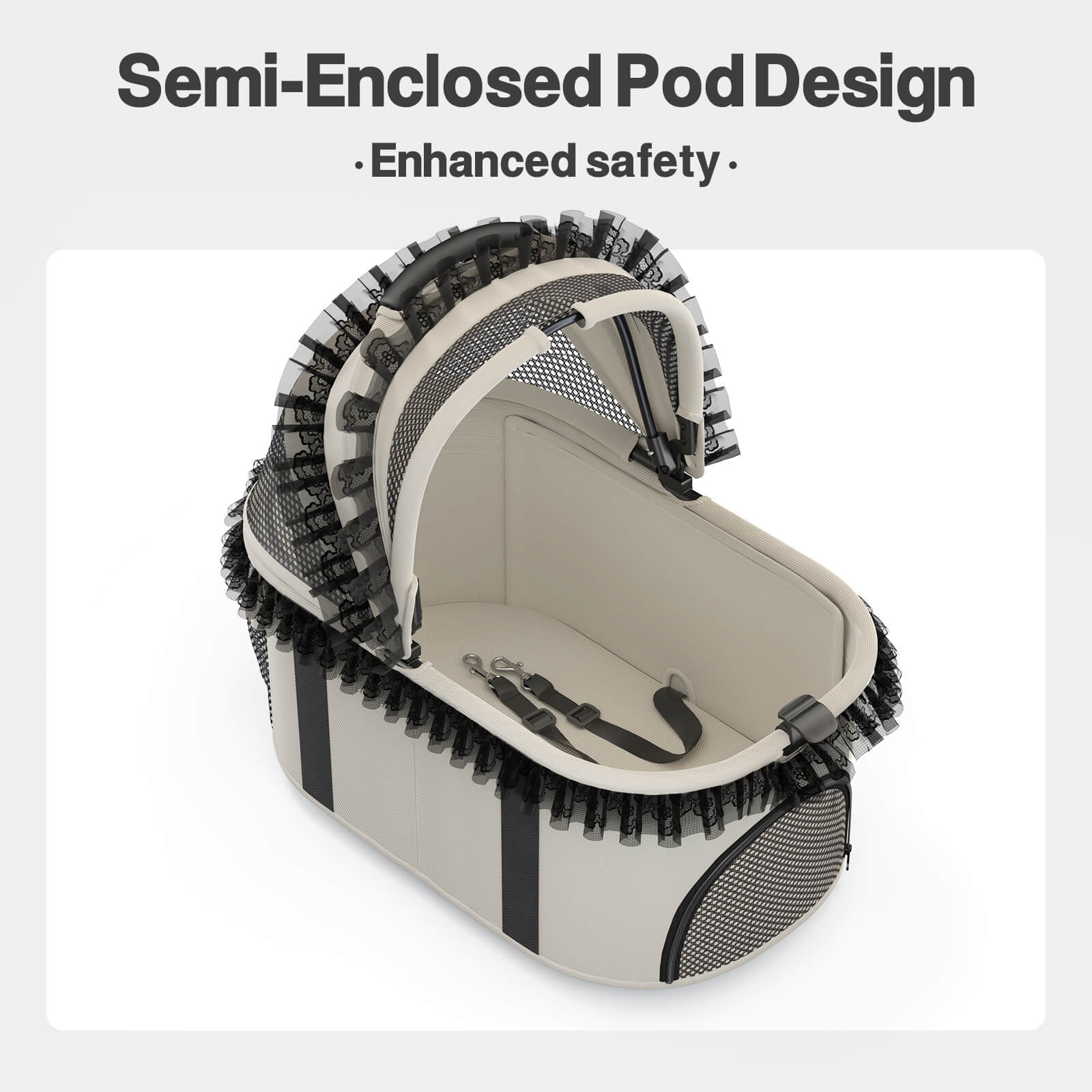 Built with durable Oxford fabric, a water-repellent coating (not fully waterproof), a removable pad, and dual safety straps, the stroller keeps pets secure while making cleanup simple. The multiple mesh designs reduce anxiety and keep pets cool and relaxed.