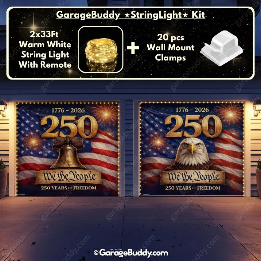 This Freedom 250 Limited Edition garage door cover features the American flag, eagle, and Liberty Bell design with “We The People” detail. Perfect for the USA's 250th anniversary, 4th of July decorations, Memorial Day, and patriotic home decor. A bold patriotic display that celebrates 250 years of American freedom, history, and pride.