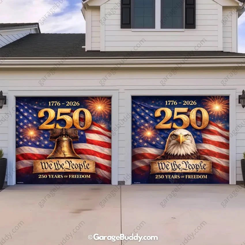 The Freedom 250 | Limited Edition Patriotic Garage Door Cover is available in the following options: Single Door (6 x 7ft) / No, Single Door (6 x 7ft) / Yes, Single Door (8 x 7ft) / No, Single Door (8 x 7ft) / Yes, Single Door (8 x 8ft) / No, Single Door (8 x 8ft) / Yes, Single Door (9 x 7ft) / No, Single Door (9 x 7ft) / Yes, Single Door (9 x 8ft) / No, Single Door (9 x 8ft) / Yes, Single Door (10 x 7ft) / No, Single Door (10 x 7ft) / Yes, Single Door (10 x 8ft) / No, Single Door (10 x 8ft) / Yes, Double Door (15 x 7ft) / No, Double Door (15 x 7ft) / Yes, Double Door (15 x 8ft) / No, Double Door (15 x 8ft) / Yes, Double Door (16 x 7ft) / No, Double Door (16 x 7ft) / Yes, Double Door (16 x 8ft) / No, Double Door (16 x 8ft) / Yes, Double Door (18 x 7ft) / No, Double Door (18 x 7ft) / Yes, Double Door (18 x 8ft) / No, Double Door (18 x 8ft) / Yes, 1.5 Door (12 x 7ft) / No, 1.5 Door (12 x 7ft) / Yes, 1.5 Door (12 x 8ft) / No, 1.5 Door (12 x 8ft) / Yes, 1.5 Door (14 x 7ft) / No, 1.5 Door (14 x 7ft) / Yes, 1.5 Door (14 x 8ft) / No, 1.5 Door (14 x 8ft) / Yes, Two Door 2x (8 x 7ft) / No, Two Door 2x (8 x 7ft) / Yes, Two Door 2x (8 x 8ft) / No, Two Door 2x (8 x 8ft) / Yes, Two Door 2x (9 x 7ft) / No, Two Door 2x (9 x 7ft) / Yes, Two Door 2x (9 x 8ft) / No, Two Door 2x (9 x 8ft) / Yes, Three Door 3x (8 x 7ft) / No, Three Door 3x (8 x 7ft) / Yes, Three Door 3x (8 x 8ft) / No, Three Door 3x (8 x 8ft) / Yes, Three Door 3x (9 x 7ft) / No, Three Door 3x (9 x 7ft) / Yes, Three Door 3x (9 x 8ft) / No, Three Door 3x (9 x 8ft) / Yes, Double+Single Door (16x7ft + 8x7ft) / No, Double+Single Door (16x7ft + 8x7ft) / Yes, Double+Single Door (16x7ft + 9x7ft) / No, Double+Single Door (16x7ft + 9x7ft) / Yes, Double+Single Door (16x8ft + 8x8ft) / No, Double+Single Door (16x8ft + 8x8ft) / Yes, Double+Single Door (16x8ft + 9x8ft) / No, Double+Single Door (16x8ft + 9x8ft) / Yes. Check the product page for current stock availability.