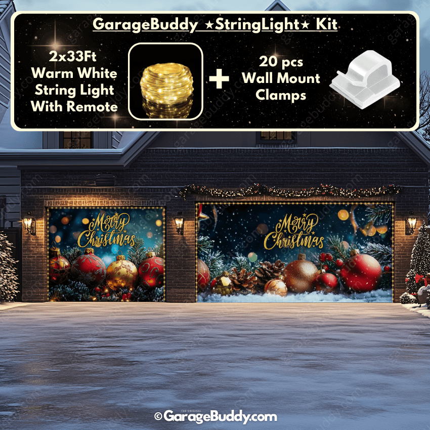 You now have the option to add the GarageBuddy string light kit to your order at 50% off and make your festive garage door cover sparkle even more. The kit includes 1x 33 ft warm white string light, a remote control, and 10 sticky wall-mount clamps. The 2-door garage option comes with 2 string light kits. Since the lights run on three AA batteries (not included), you don’t need to worry about extension cords or outlets.